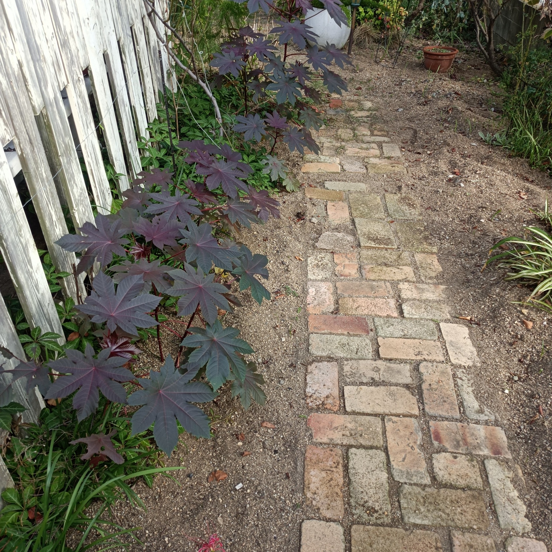庭ではこぼれ種のトウゴマが育ってトウゴマ通りになっています。