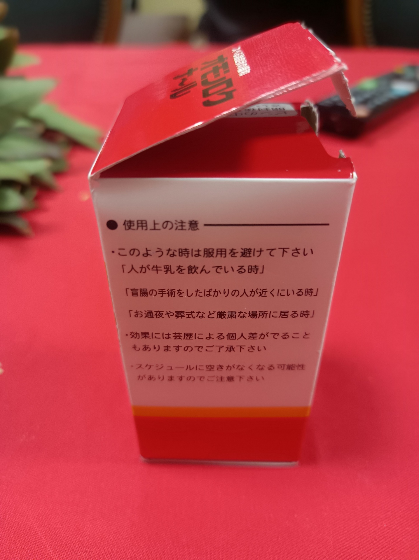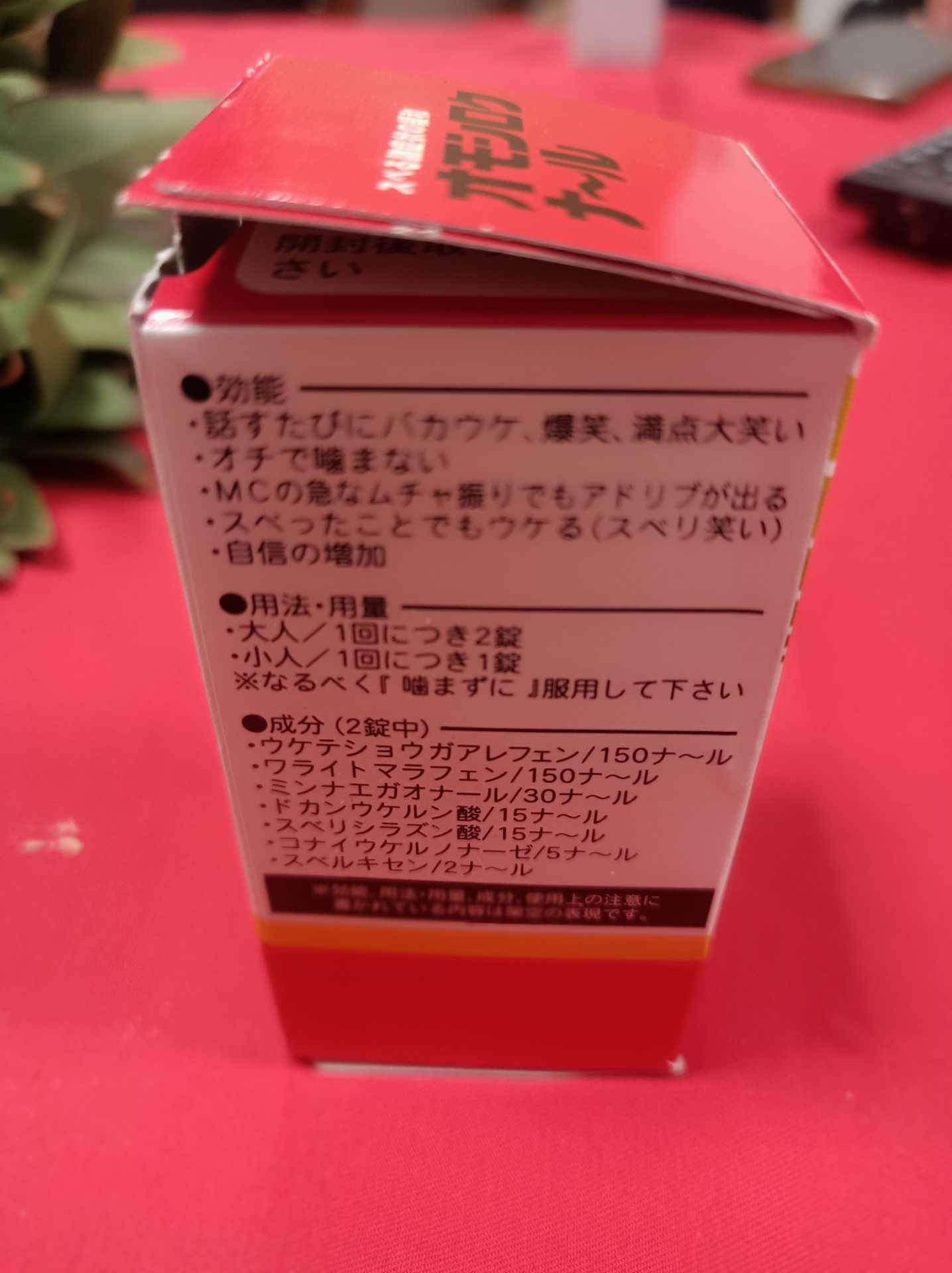 クリスマスプレゼント 理乃はキックボードとオモシロクナールという薬をサンタさんからクリスマスにプレゼントされました。 理乃はオモシロクナールを主人にプレゼントしました。 成分も笑えます。 使用上の注意まであります。 発売元はよしもとでした。 Tweet Applaud0 通報