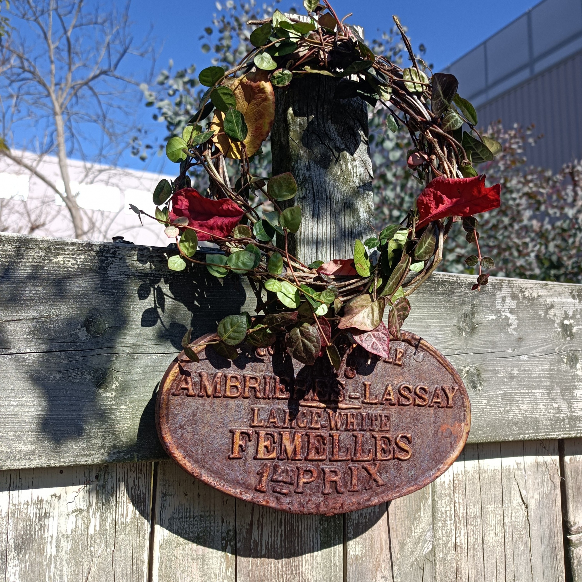 ヘンリーヅタの余って転がっていたものでリースを作り、ハツユキカズラを長く切ってそれに巻き付けました。