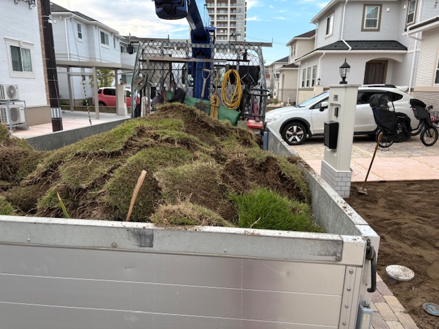 ユンボで剥ぎ剥ぎしましたそれにしても、剥いだ芝生は重い