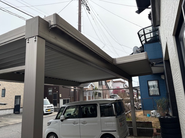 母屋の屋根にカーポートの屋根を入れ込みまして、雨仕舞いも非常に良いです!!