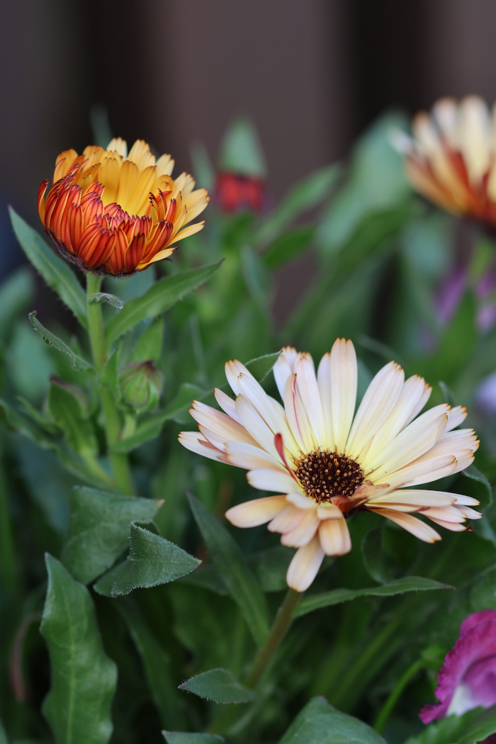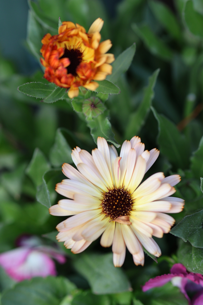 ピンク系のパンジーと寄せ植えしたカランジュラ コーヒークリームが