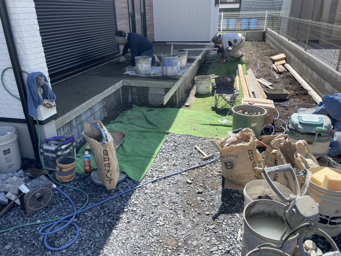 タイルデッキ部分の準備をしますIMG_5224 IMG_5225ブロックを積みますIMG_5283 IMG_5295 IMG_5297 IMG_5305下地生コンを入れますIMG_5307 IMG_5356タイルをはって完成しましたIMG_5363