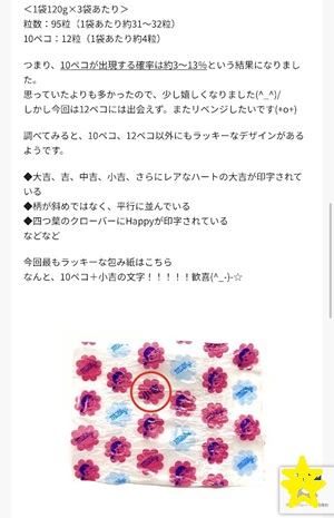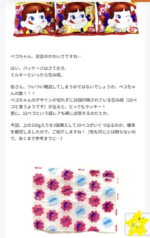 ペコちゃんが10個印刷されてるとラッキーで、大吉・中吉・小吉 ハートの大吉などのラッキーなのが色々あるみたいですね。 (*^-^*)