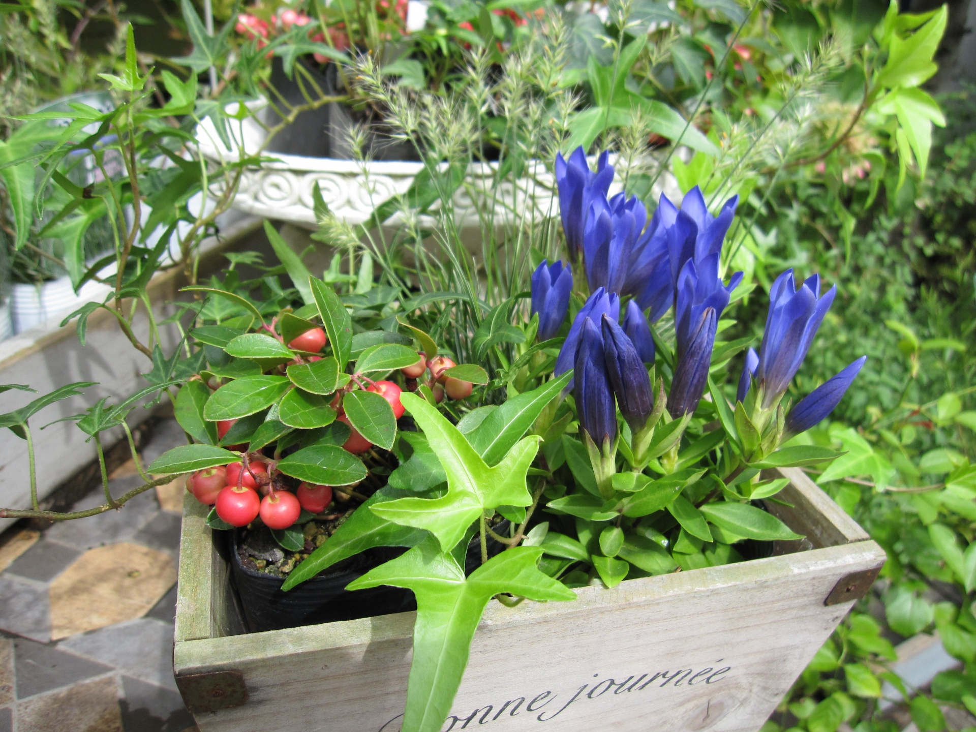 リンドウとペニセタム、ヒューケラのポットをブリキの缶へ寄せたのですが(↑の写真)